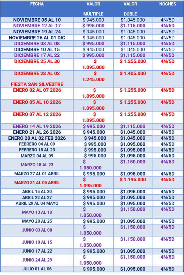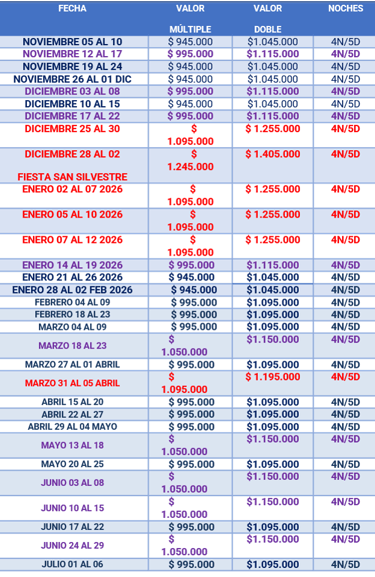 ● Niños menores de 2 años solo pagan $65.000 (Seguro de viaje)